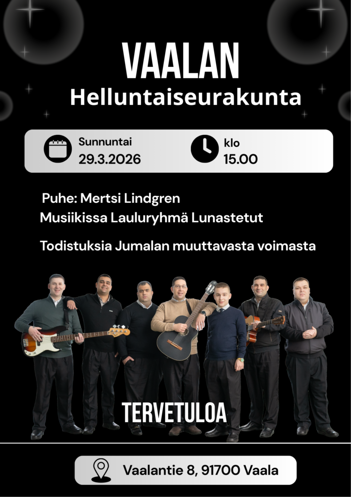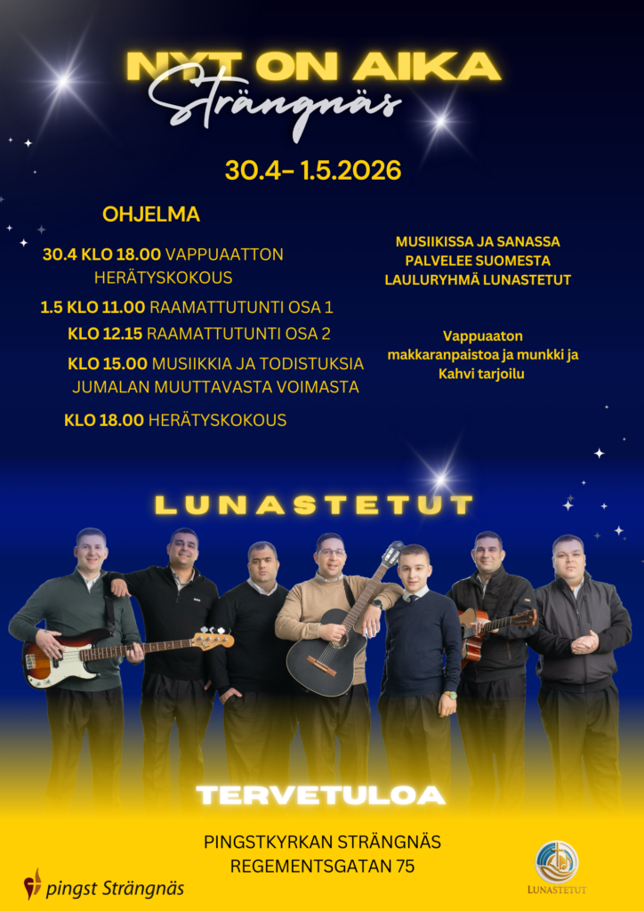 Lunastetut ry:n tapahtumakalenteri kokoaa yhteen kaikki yhdistyksen seurakuntavierailut, tilaisuudet ja muut ajankohtaiset tapahtumat. Kalenterista löydät tiedot tulevista evankeliumi-illoista, konserteista, koulutuksista, yhteistyötapahtumista sekä muista kohtaamisista eri paikkakunnilla.